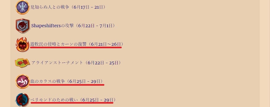 「遊牧民の侵略とカーンの復讐」が26日までになっているにも関わらず、「ブラッディクロウの侵略(ここでは「血のカラスの戦争」と表記されていますが・・・)」は25日から始まることになっています。