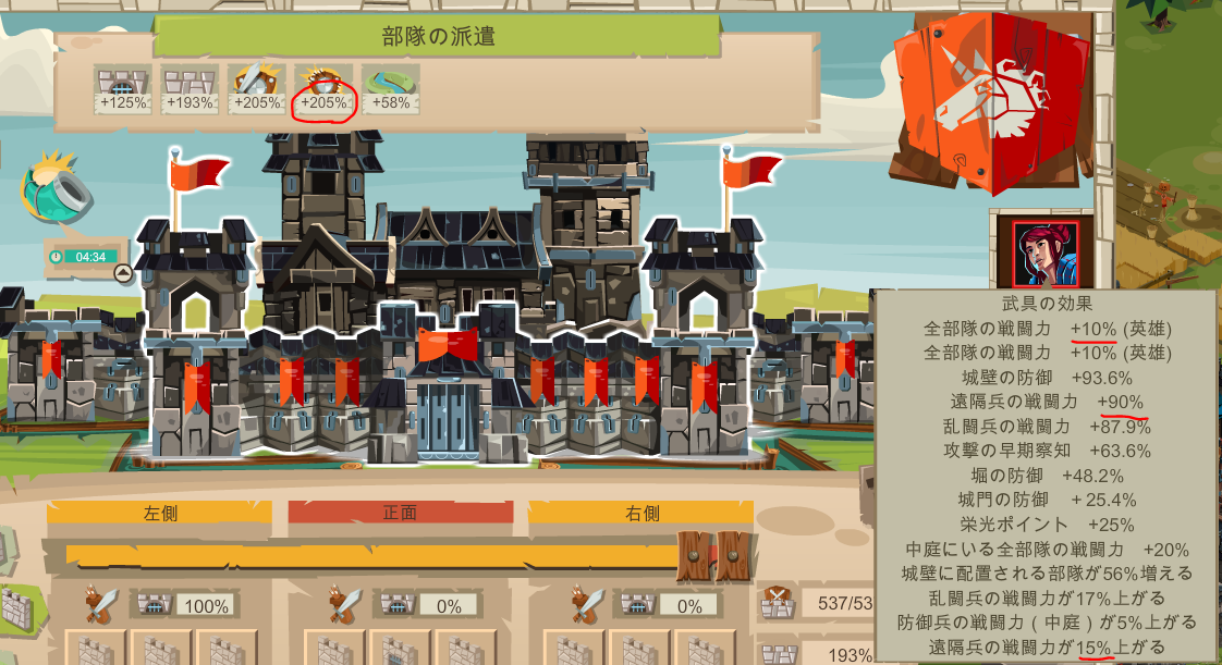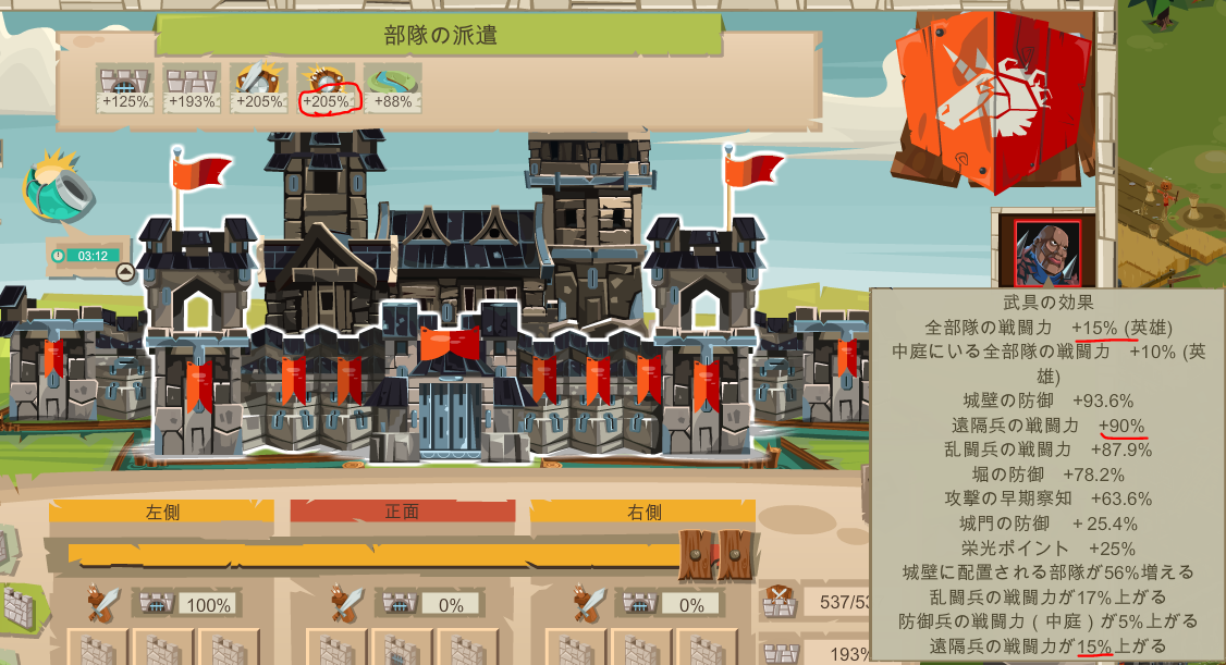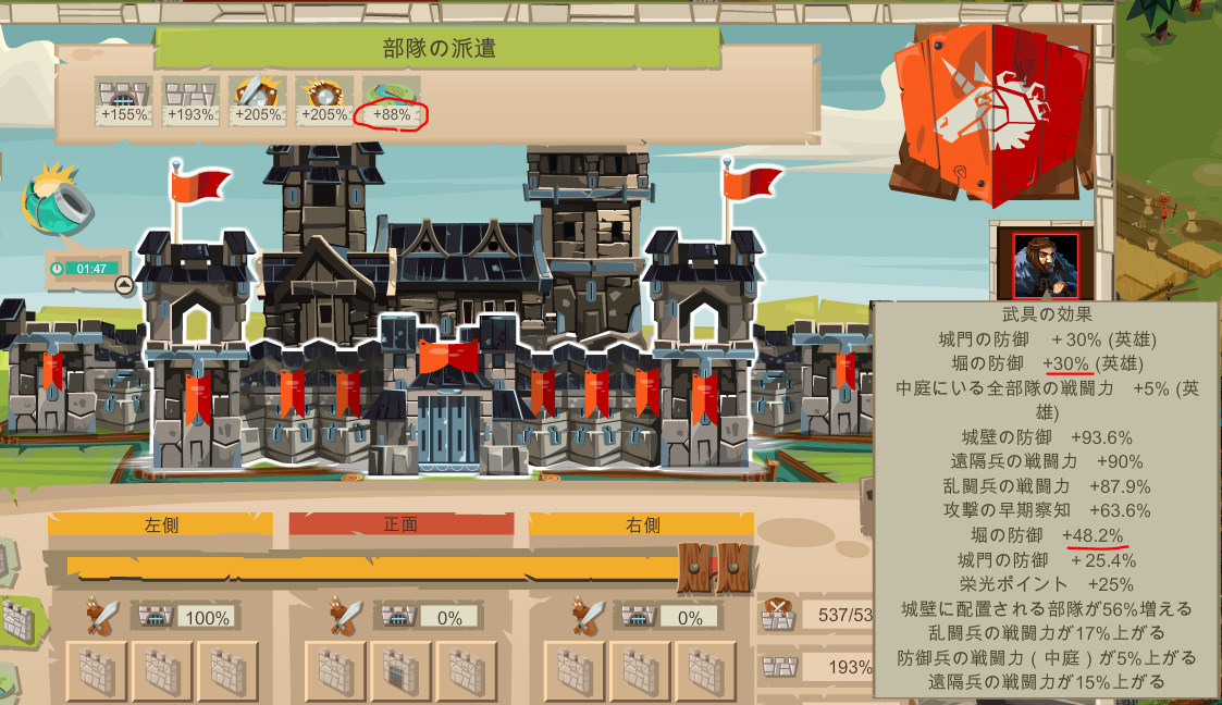 堀の防御力(10%)+城主装具(48.2%)+英雄(30%)=88%