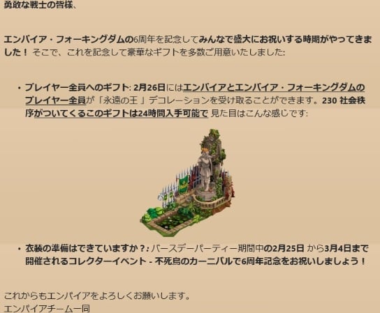 EMPIRE:FOUR KINGDOMSが6周年なのを記念して、プレゼントで美しい装飾アイテム"Monument der Thronfolge"を受け取れます。230の社会秩序。