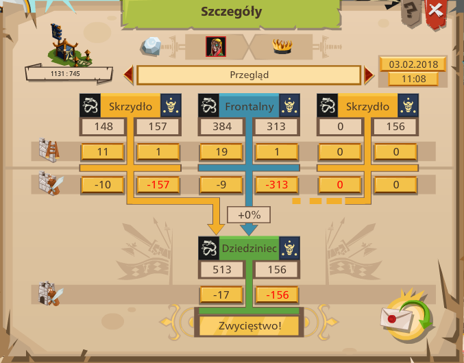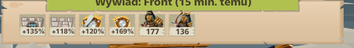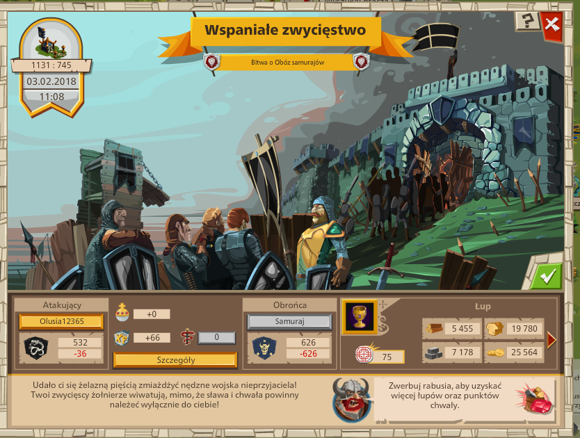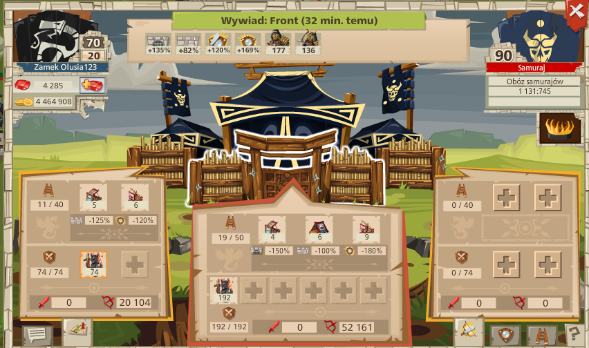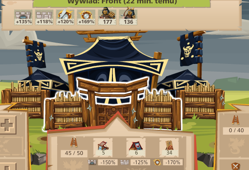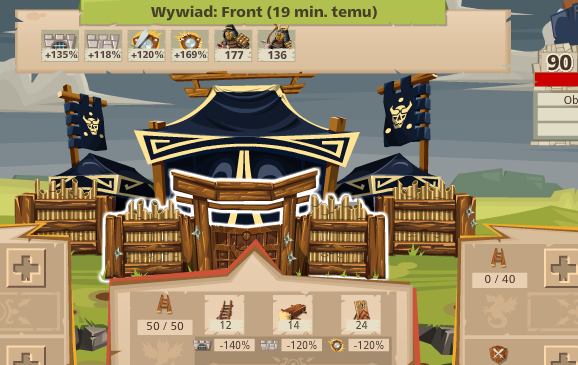 Jak widać, drewniana drabina oraz taran zrobił swoją robotę - odejmują po -10% więc efekty jak widać. Trochę nam nie udało się wyzerować dystansu - tego tak zostawić nie możemy, więc szukamy u siebie lepszych taranów i drabin (z eventu samuraje/nomad) i mamy tak: