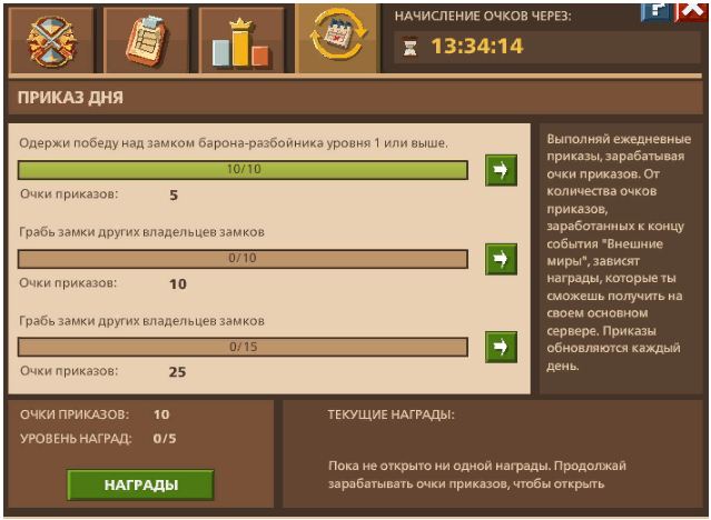 как нащитывает очки приказов бил 10 башен пока птица была давало по 5 очков два дня на третий день побил 10 разбойников и около 30игроков дало тож 5 очков