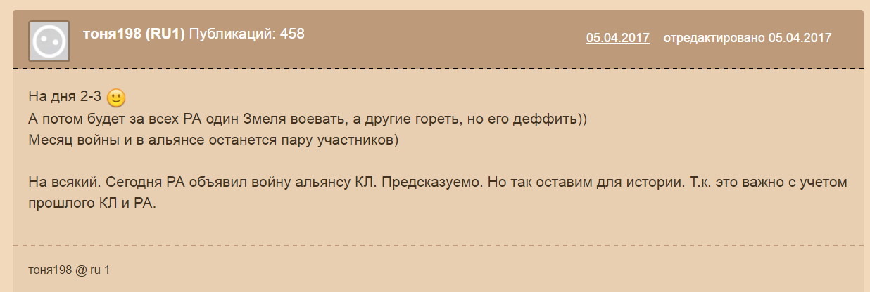 единственное ... "сам" это не совсем про него, а про его товарища, но кто сейчас разбираться то будет, вместе с тем кто будет делать различия в "бегать по альянсам" и "выйти в санаторий", впрочем боевые санатории ох гладиаторы отпинали в самом начале вара и тут о причинах не вспомнит никто, важен только факт ) ущербность мышления такая, ничего не поделаешь