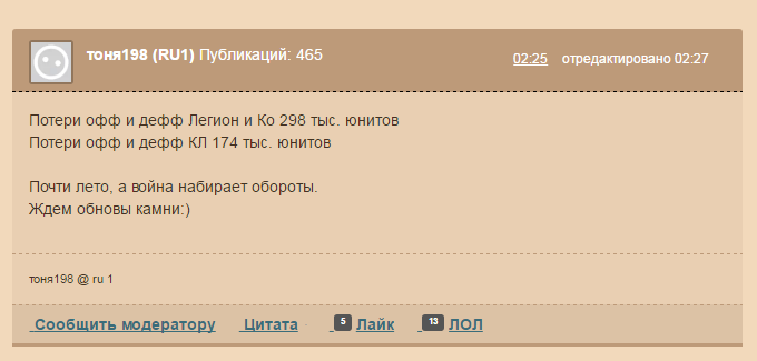 А цифры получились следующие: при попытке удержать захваченный в нашей академии пост КЛ потерял 91 тысячу деффа, но пост удержать не смог после чего наш лидер зашел к Антонине на чай, чай стоил нашей славной принцессе еще 16 тысяч деффа. Итог этих двух событий обошелся КЛ в 106 тыс юнитов, при этом опять же не учитываем дефф который перебрасывал КЛ на пост в ходе удержания захвата. Далее от атак легиона КЛ потерял еще около 40 тысяч, затем в графе разное на страничке КЛ я нашел потери КЛ от атак РА еще 34 тысячи юнитов и в итоге получил, что только в обороне КЛ потерял