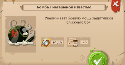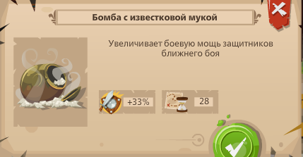 1. Бомба с известковой мукой(мука) - оборонительное орудие, увеличивает силу юнитов ближнего боя на 33%