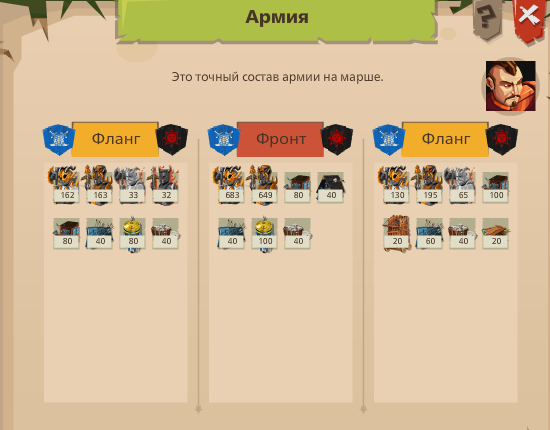 Шпионим лагерь максимального уровня один раз, расстановка в нем не меняется, заходим в нападение, выбираем самого слабого генерала, которым вы будете нападать, выставляем обвесы, чтобы они перекрывали защиту(сильный фланг не трогаем), выставляем лучников. Дальше, сохраняем такую расстановку в предустановку и нападаем