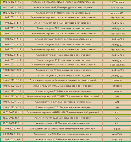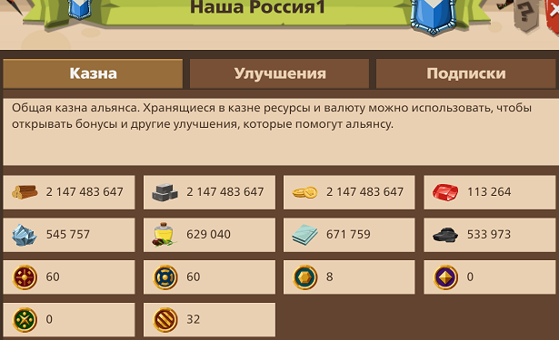 Благодарим альянсы АТРИум, -Σπάρτα-, Lords of Unicor, Путь Авалону и Гвардия Сапфира за помощь ресурсами и золотом в казну нашего альянса! Отдельная благодарность игрокам Crystal Palace, они трижды пополнили нашу казну. Список благодетелей может пополниться!