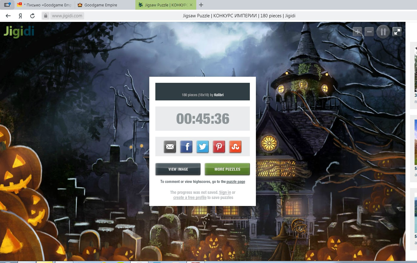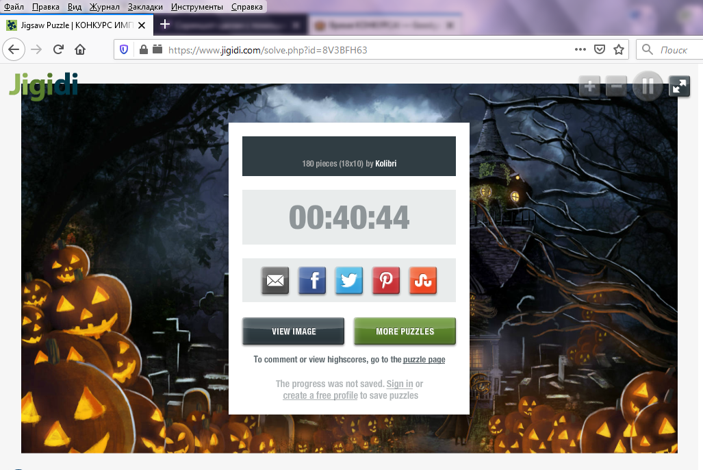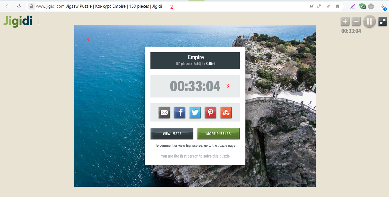 2. Сделать скрин, на котором будет видно время (3), потраченное на сбор пазла, название сайта (1), адресная строка (2) и собранная картинка (4). Пример в спойлере, картинка взята из предыдущего конкурса.