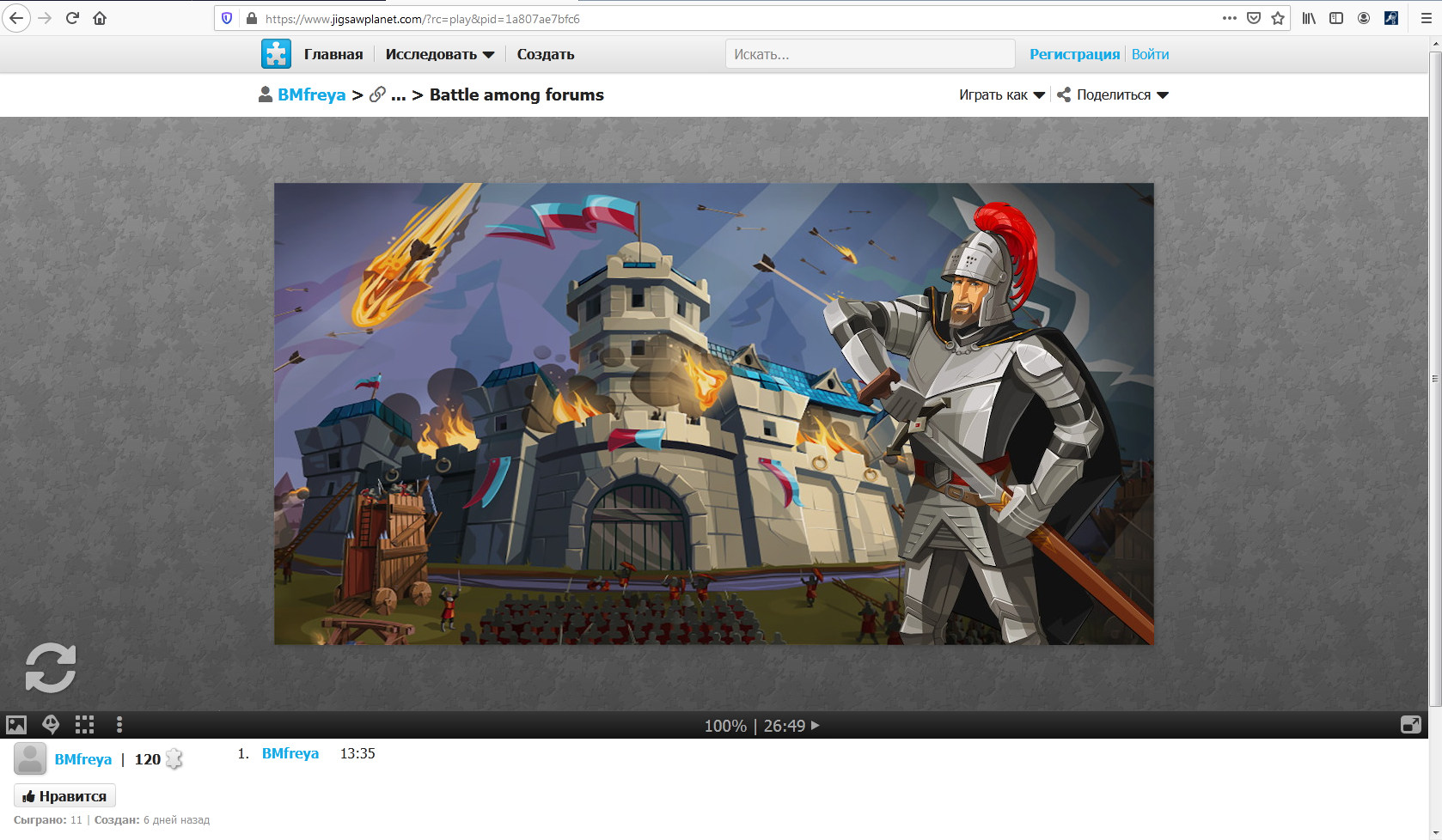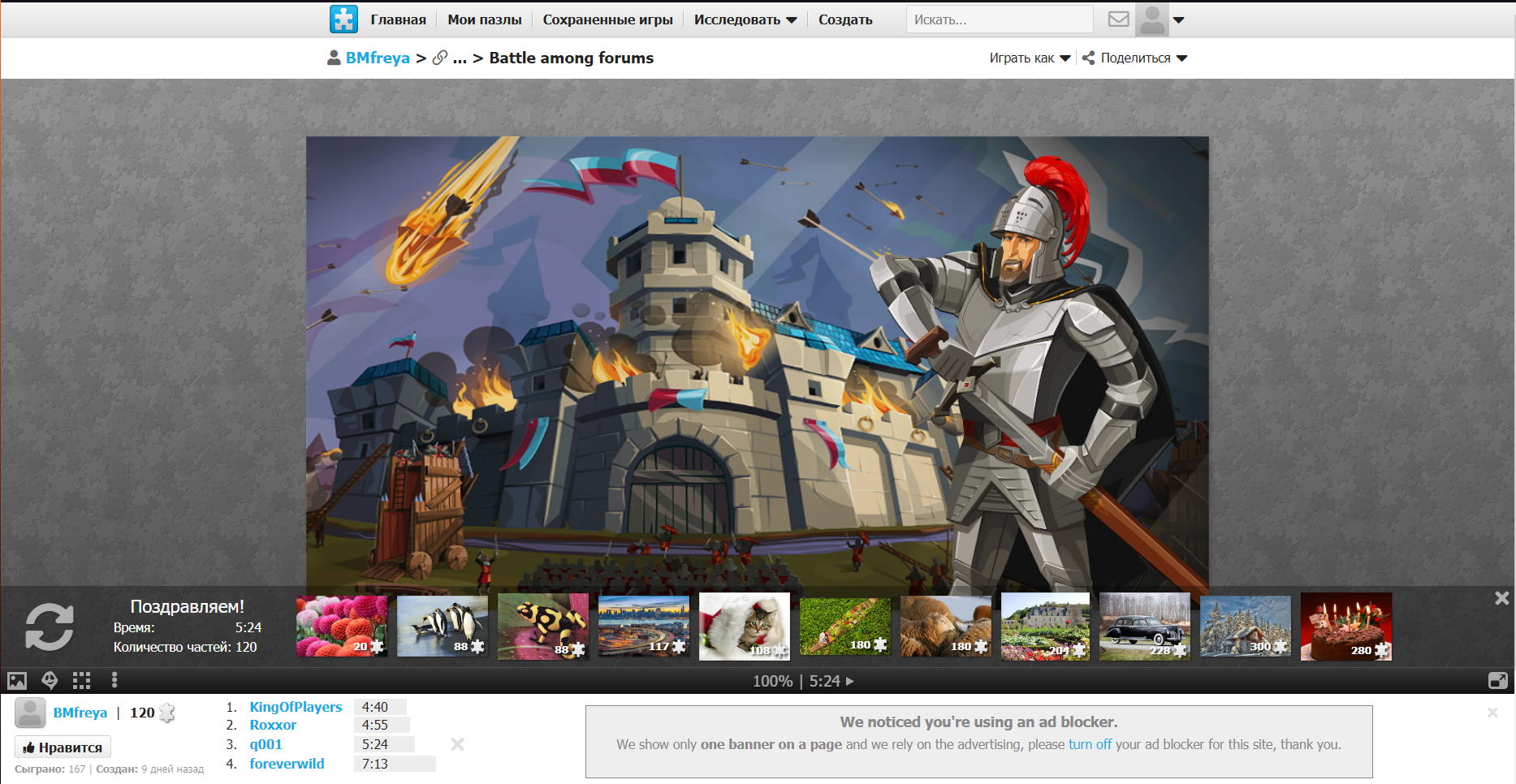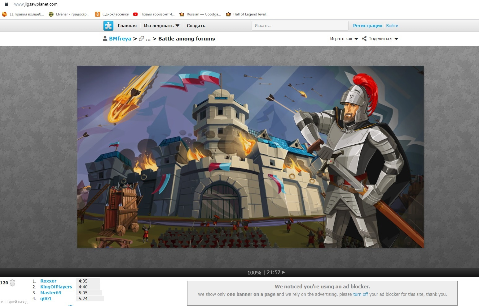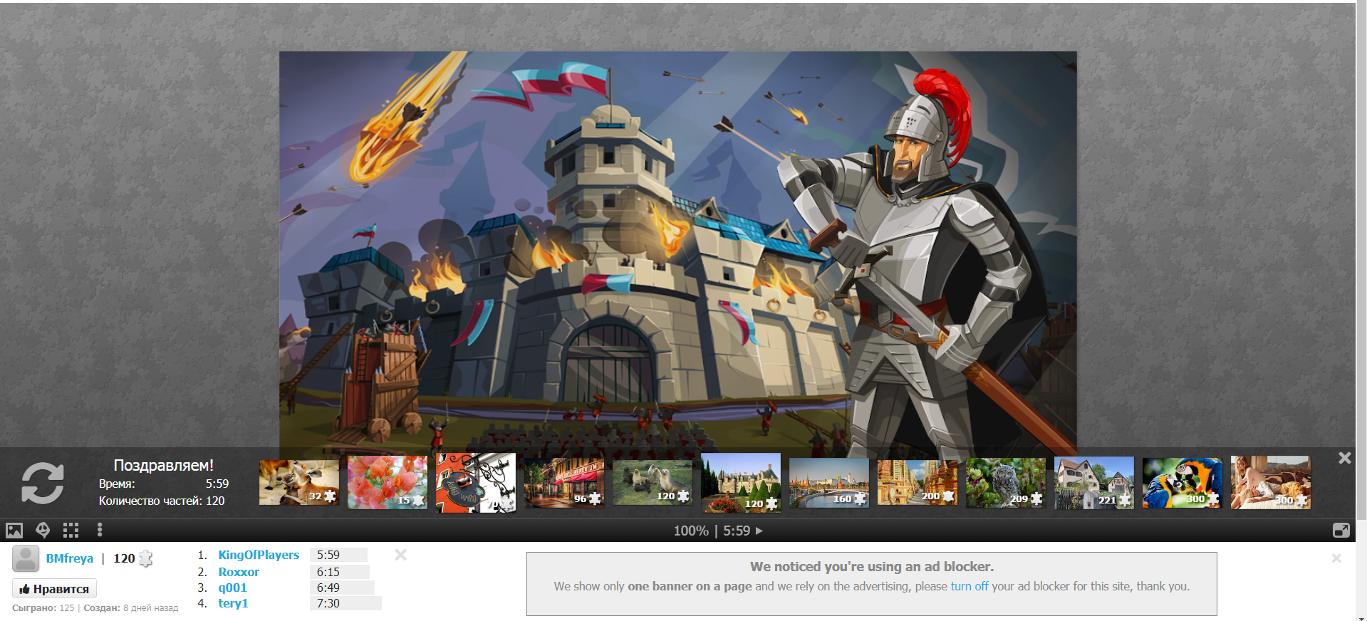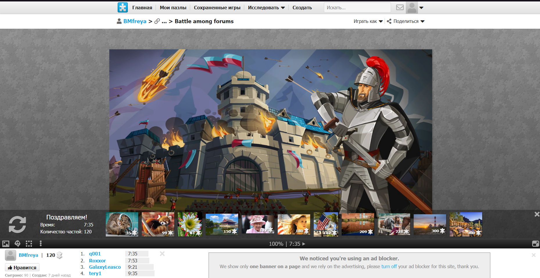P.S. @Азриель Дриммур (RU1) был исключен из участников конкурса из-за несоблюдения условий. Мы не просто так попросили давать ответы в определенном формате и предоставили вам пример ответа. Если обратите внимание, то в примере видно автора и количество пазлов из которых состоит картинка. Для того что бы сделать скрин в нужном формате регистрация на сайте не была нужна.