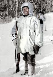 yukarıda gördüğünüz asker Finlandıyalı keskin nişancı Simo Hayha'dır dünyada 100 gün içinde 705 düşman askerini öldürmüştür 505 keskin nişancı tüfeği ile kayıtlı atışı 205 kendi makinalı tüfeği 9nm soumi ile gerçekleştirmiştir.