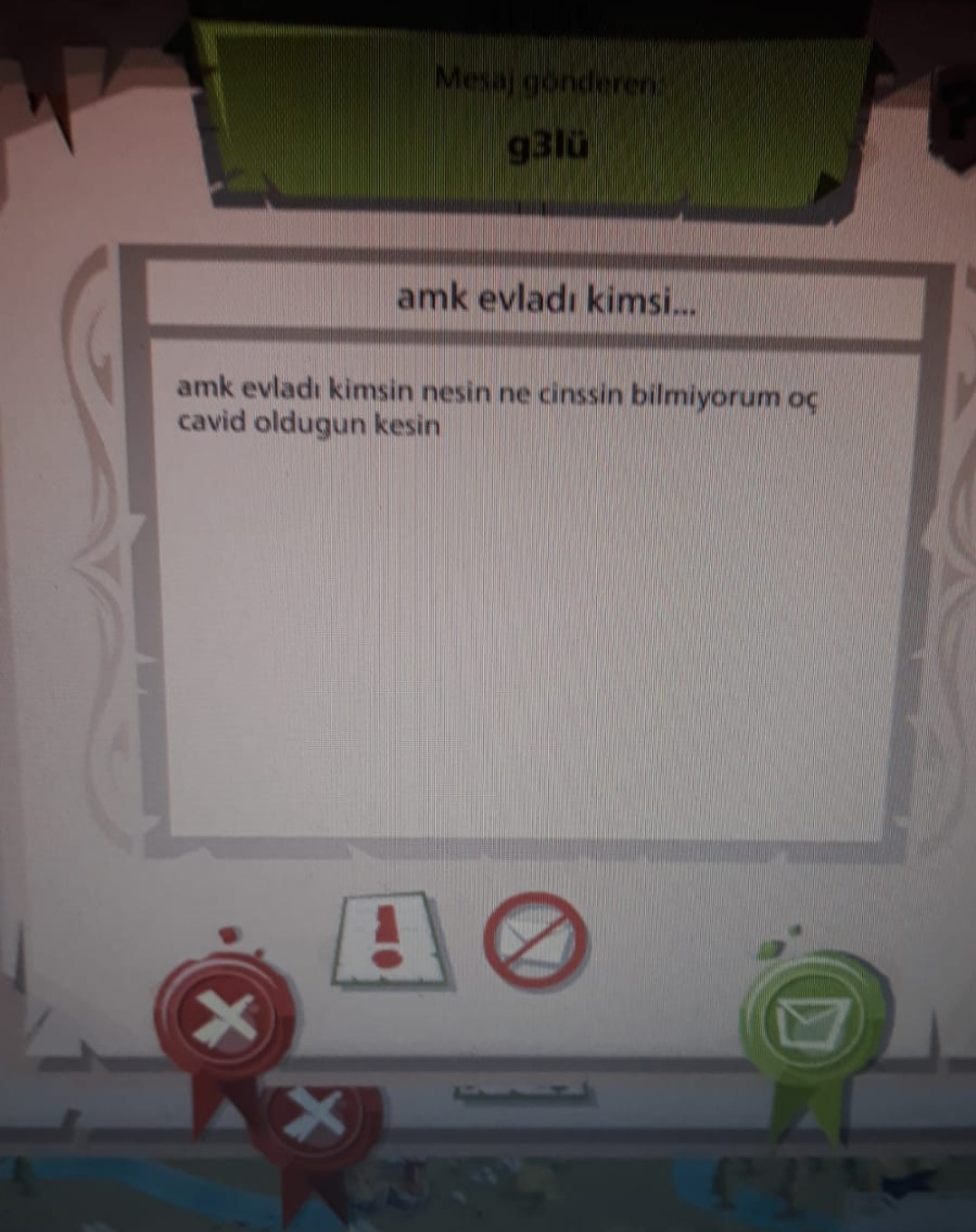 1-) Caps lock açınca haklı olmuyorsun.g3lü (TR1) dedi:OYUNU REEL GİBİ YAŞAYANLAR ONA BUNA YAKUT ÇEKİP DE BAŞKA İTTİFAKLARA ÜZERİNE SALAN BİZİ ARAYIP FARKLI KONUŞAN BAŞKALARINA FARKLI ANLATAN SİZİN OYUNDAN ÖNCE PİSKİYATRİ GİDİN TEDAVİ OLUN SİZE TAVSİYEM BİZİM İÇİN KARAKOL OLMASI VEYA KÖY OLMASI KALE YANMASI SIKINTI DEGİL AMA BU SAATTEN SONRA DARK VE YANINDA YER ALAN KİM OLURSA OLSUN TEAM OLARAK RAHAT VERMEYECEGİZ BU KADAR İFTİRA AT SONRA SABUN GİBİ ÜSTE ÇIKIN