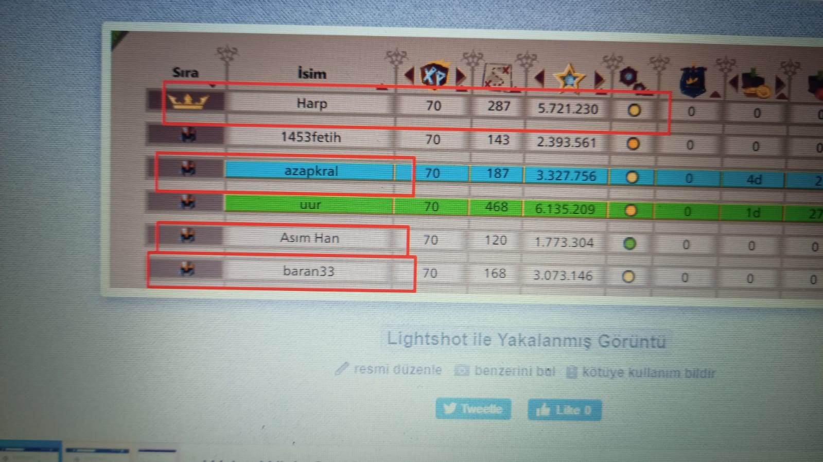 FB BOZKURT1907 (TR1) dedi:haksızlık olmasın diyedir belkide hem dediğim gibi benim kalemde sağlamdı.1453fetih (TR1) dedi:Güzel ss Almışsınız Elinize Sağlık.Legend2490 (TR1) dedi:İttifak patlatıldığı anda alınan ss.İki kalenin onlinesi 48 saat yani o kalelere sızma ihtimali yok ama tedbir amaçlı ilk gün o kalelerinde rütbesi alındı.4 kale kaldı harp kalesine sızma olsaydı zaten ittifak yok olmuşdu liderlik verilcekti düşük lvl kaleye gerisini siz düşünün.Bu durumda da 3 anka kalesi kaldı bizde normal olarak o kalelerden şübhelendik.Bizim şüphemiz kalelerden kişilerden değil yoksa şuanda Barışında benimde rütbem olurdu ama kalelerimiz güvenilir olmadığı için rütbede yok.Anka kalelerininde zor zamanda ve şüpheli durumda ayrılma kararı almasıda arayı iyice açtı