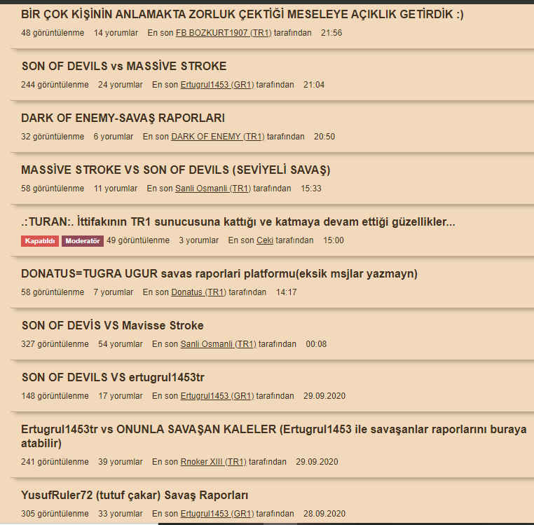 doğru diyorsunArda love İrem (TR1) dedi:savaş raporu yazan çoğu konuda maks 10 rapor vardır 20 sayfa konuşma vardı herkes birbirine sallıyodu atarım keserim tutarım yakarım ama hiçbirşey göremedik ortada