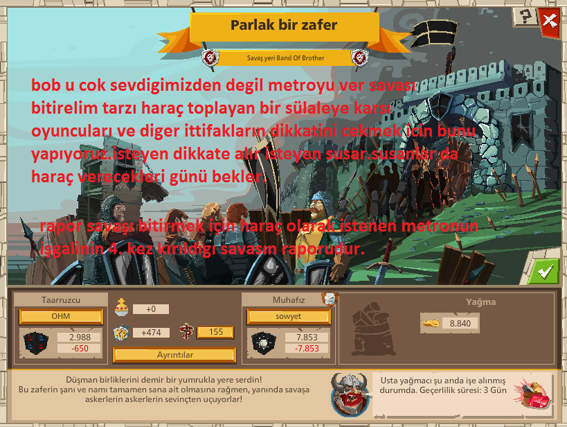 Ayrıca belirteyim, her saldırı savunulmaz veya her saldırıya kapı açılmaz. Kesilecek bir saldırıysa zaten savunuyoruz buraya da koyuyoruz raporu. Bizim veya benim bir saldırıya kapı açtığım veya savunurken yenildiğim bir raporu forumda diğer ittifaklardan görürsün zaten.