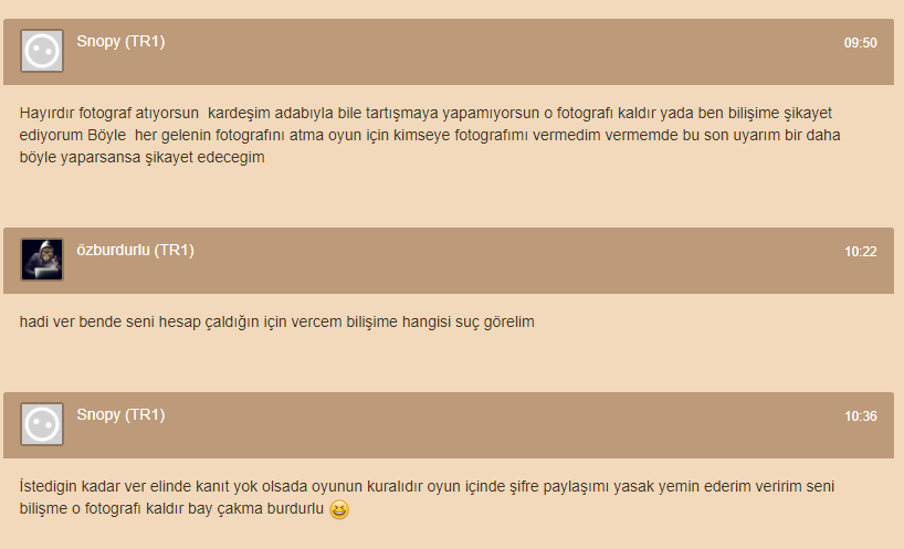 Görüyorum ki Sana yazdıklarıma açıklama yapamamışsın. Bu hareketinle çirkefliğini, iftiralarını kabul etmiş oluyorsun. Ben şereften bahsediyorum çünkü beni herkes tanıyor. Oysa sen tanınmamak için kimlikten kimliğe bürünüyor utandığın kişiliğini saklıyorsun. Nedir seni korkutan, nedir seni ekran arkasına saklanmaya iten? Bunları söyle sana yardımcı olayım.özburdurlu (TR1) dedi:bülent bi sus artık ne çene varmış sende git kaleni geliştir lak lak etme buradaBİLOmmm (TR1) dedi:Farklı kalelerle haritada, farklı maillerle/isimlerle de forumda yaptığın sahtekarlığı herkesten ummakla kendine işkence ediyorsun. Bana taktik veren varsa o kişi şerefsizdir, haysiyetsizdir. Senin de haysiyetin şerefin varsa yorumlarımı başka birilerine mal etmekten vaz geçersin.