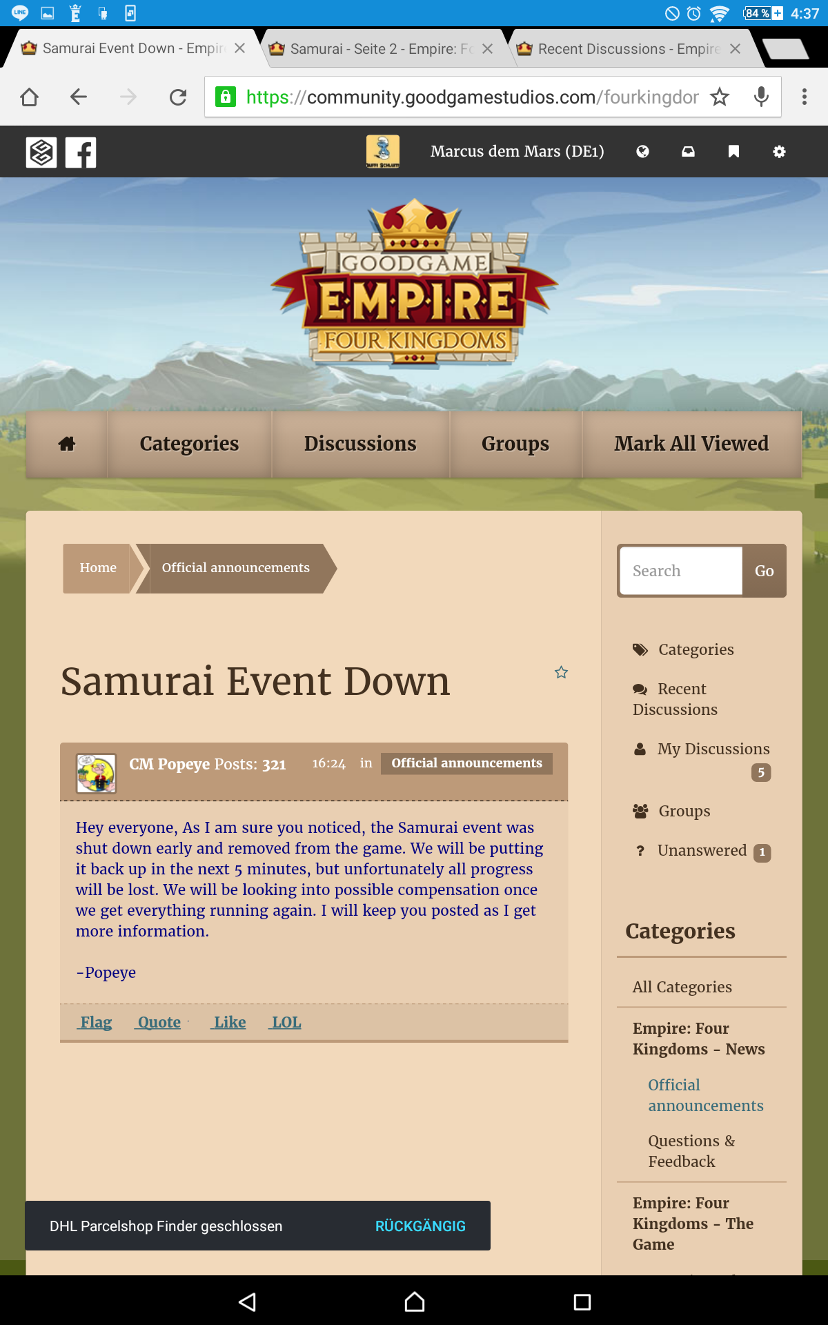 Damit wir wieder wochenlang Hinterher rennen dürfen ??? Support ist genauso ne gurkentruppe!Alpinolo schrieb:Ganz ruhig! Das Event wurde soeben neugestartet und dieses mal hoffentlich ohne jegliche Probleme. Ihr könnt euch bezüglich Verluste gerne an unseren Support wenden. Was und wie genau er diese Fälle handhaben wird, wird momentan noch besprochen. Ich halte euch auf den Laufenden.salidany (DE1) schrieb:Mario willst du mich komplett versrschen ? Soeben das dritte mal geatartet