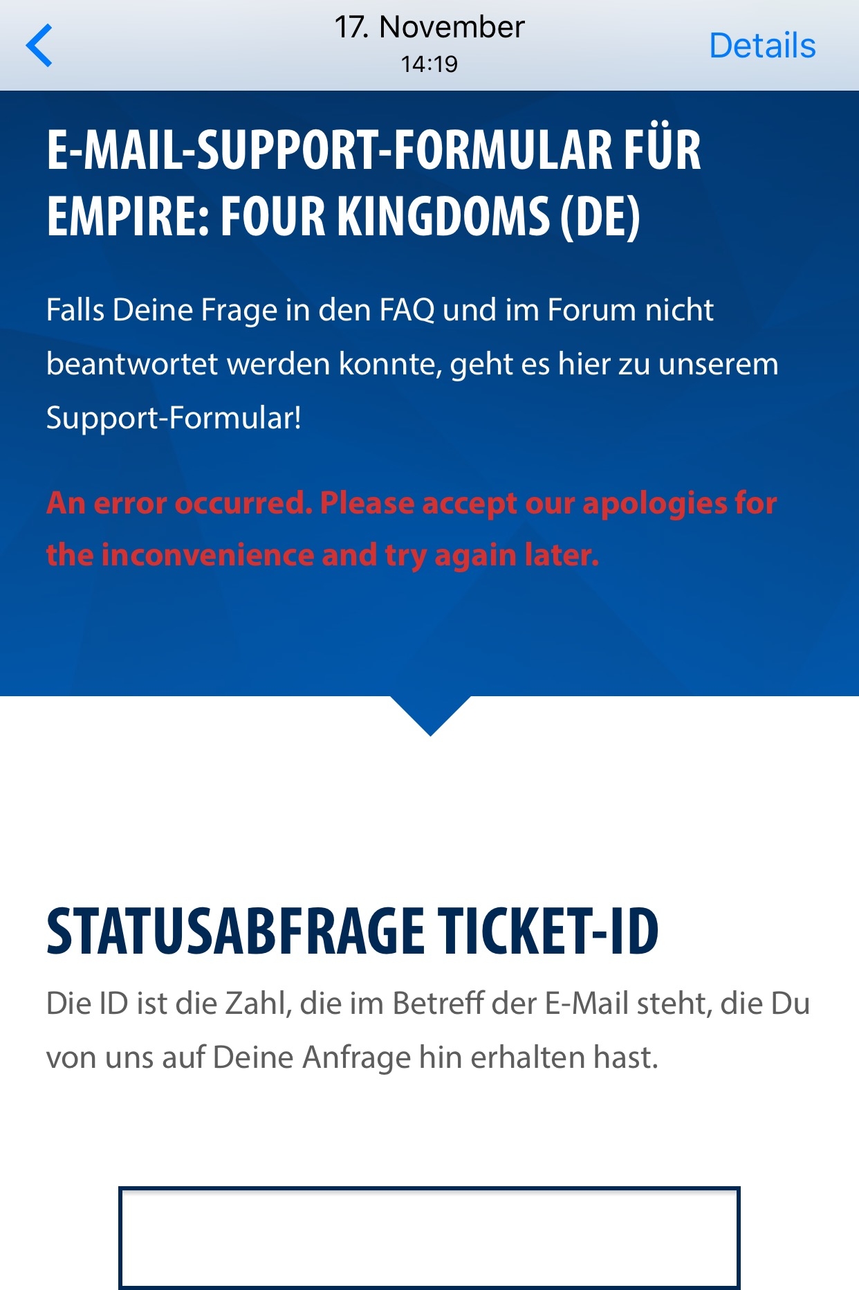Es tut uns Leid, dass du durch die Probleme im Spiel sowie mit unserem Support Formular verärgert bist. Wir versuchen gerade zu evaluieren, wie wir dir und alle anderen Betroffenen das "Hinterher-Rennen" ersparen können. Jedenfalls steht euch unser Support stets zur Seite.Mario, ich kann seid Wochen kein Ticket eröffnen weil euer Schuppen selbst dafür zu dämlich ist!