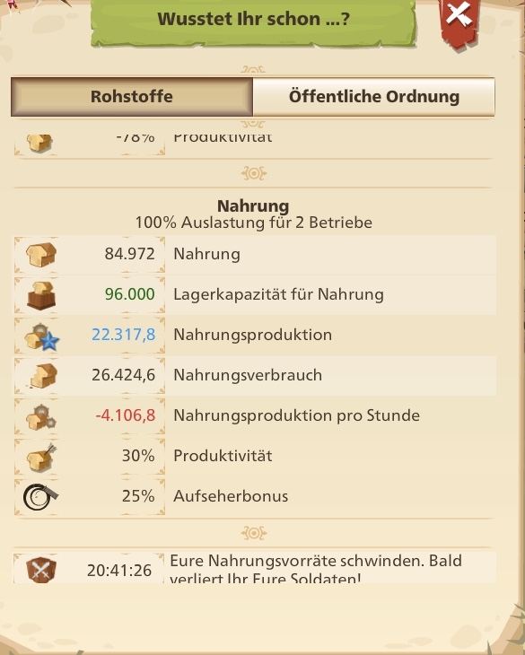 Somit gehe ich davon aus, dass diese Anzeige hier stimmt (Grundproduktion 187 *20,814 = 3892,2 —> ups...da fehlen ja 2,1 Nahrung zu unseren Ungunsten...egal...wir wollen nicht kleinlich sein und sagen einfach: das stimmt).