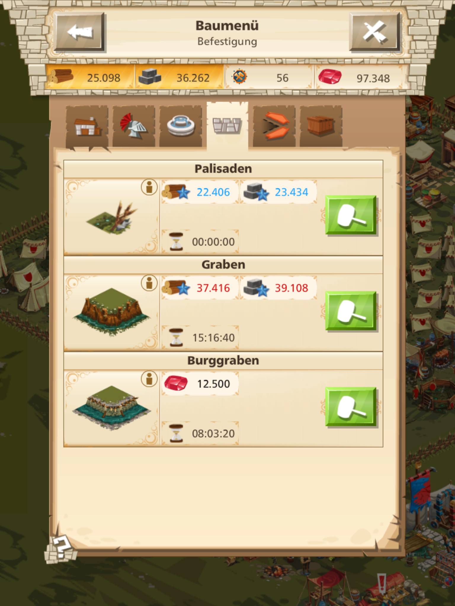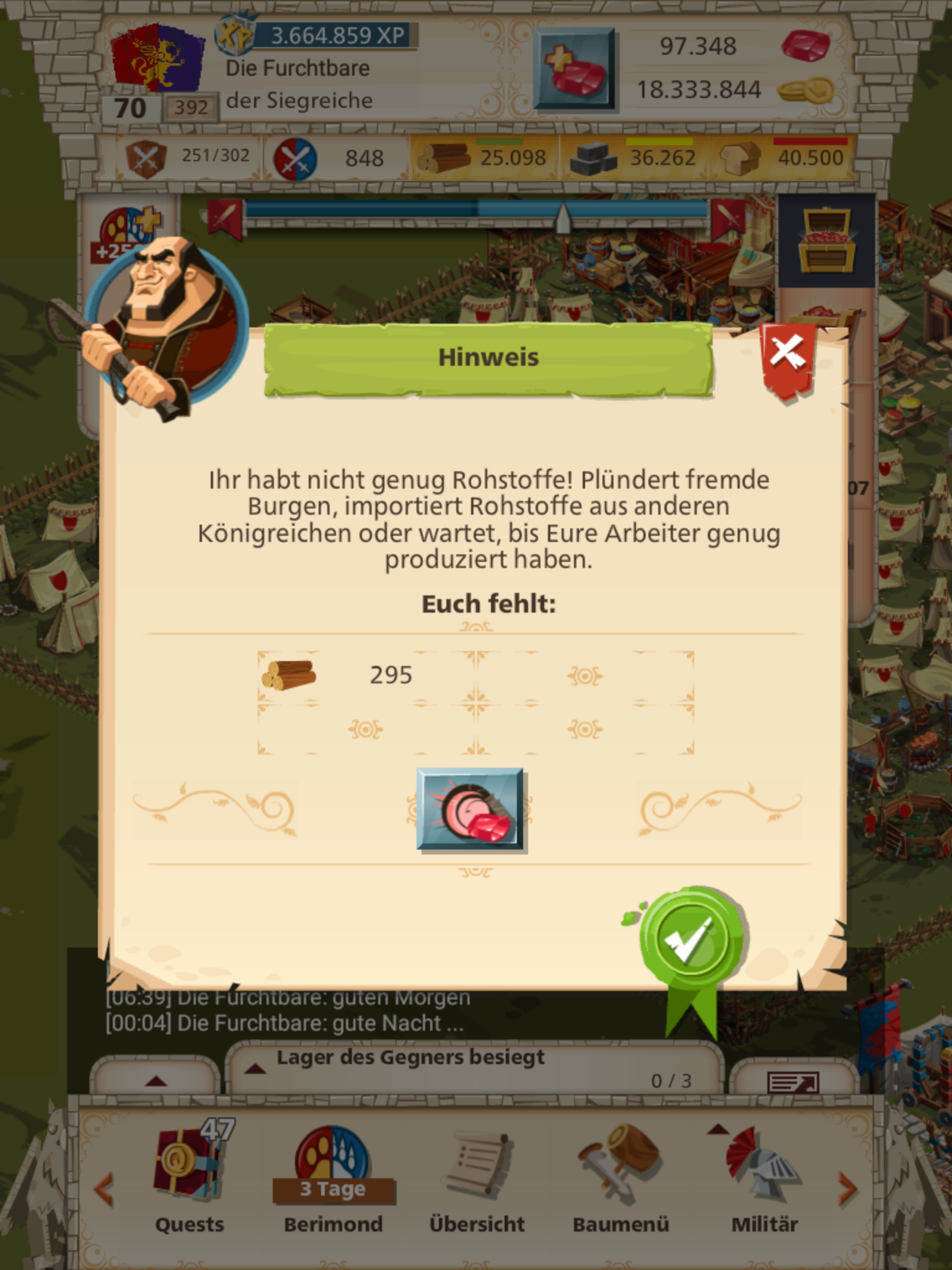 Das erste Mal wollte ich das Prüfungsgelände ausbauen, das zweite Mal die Palisaden. Wie man sehen kann hatte ich beide Male mehr als genug Holz, soll aber welches für Rubine kaufen. Hä?
