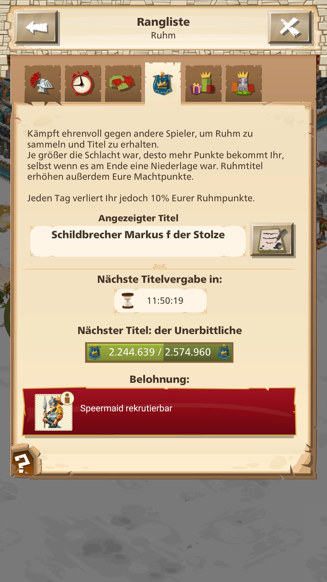 Hier @happy hab noch einen älteren screen gefunden wo der timer war obwohl er ja laut der aussage deines mitarbeiters nicht sein könnte da es ja vom ruhm her uninteressant ist da man den titel ja aktuell nicht erreichen kann .also wurde was geändert !