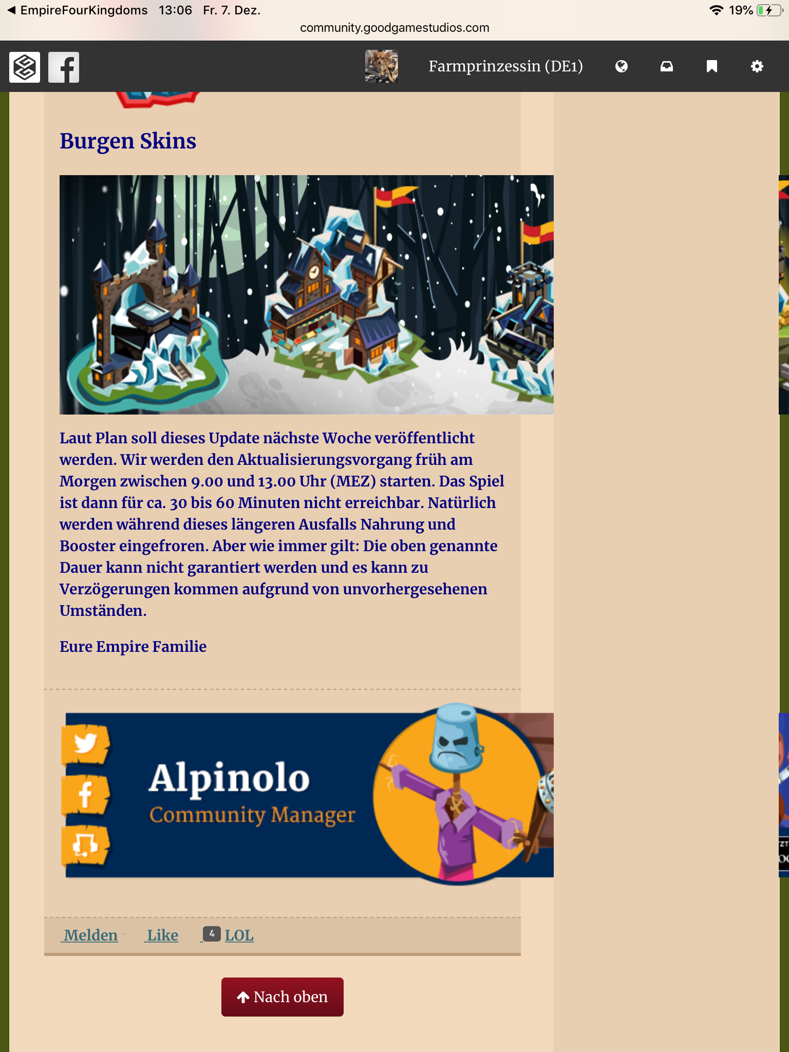 Update durchgeführt. Private Dörfer sind da und die neue dorfansicht finde ich auch recht ansprechend. Leider kann man keine Dörfer kaufen, da man keine dorfmarken kaufen kann. Habe den Waffenschmied durchgesehen, den fahrenden Händler und sogar den ausrüstungshändler. Keine dorfmarken da.Overdune schrieb:Sunnyboy2111 (DE1) schrieb:Overdune schrieb:Nein es kommt morgen ;-)Sunnyboy2111 (DE1) schrieb:vielleicht heute?Castle B. (DE1) schrieb:jetzt ist die angekündigte Woche zur Hälfte rum und nach wie vor keine Informationen von GGS wann das Update kommt.