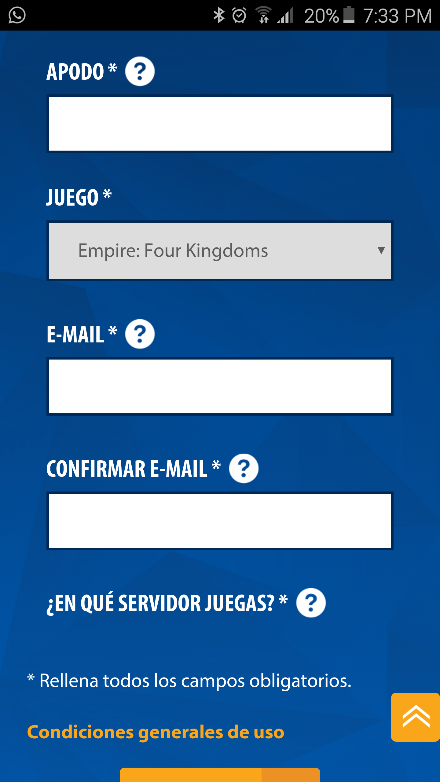 pues lo prove en todos jaja Android, IOS y hasta en mi Pc y nada sigue apareciendo igual no deja poner el servidor ya intente mucha veces y nada sabes a quien puedo informarle de ese problema para que lo arreglen ?Jodmar dijo: