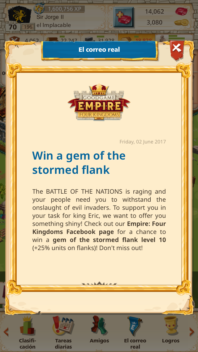 Para ganar esa gema debes de participar en página oficial de Facebook de E4K.Hola @simonbunbury (MX1)simonbunbury (MX1) dijo:Buen día, creí que la guerra de los reinos empezaría en junio, y no veo nada acerca de ese evento, cuando empezará exactamente?
