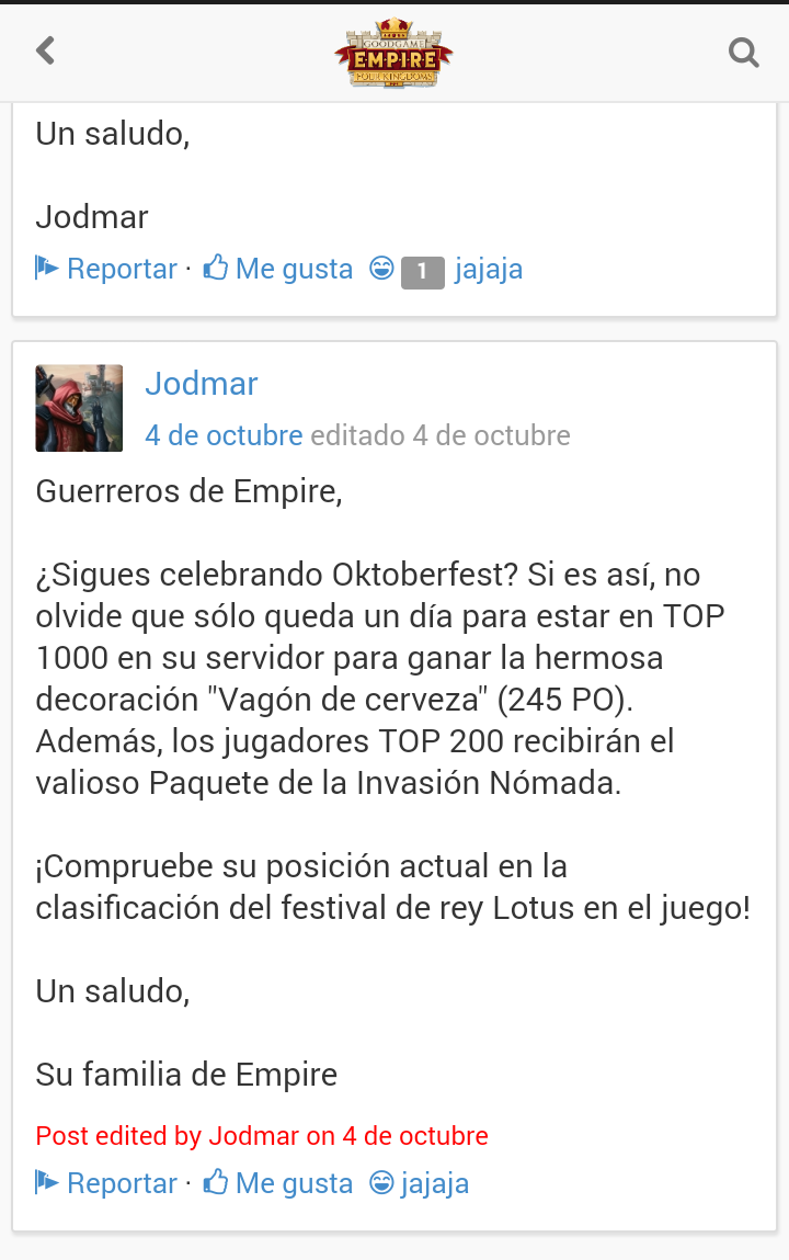 Deben ampliar el top minimo a 500 en cualquier evento ya hay muchos 70 y es dificil permanecer en top deben ampliarlo nprmalmente 1 sola alianza se lleva el top en dicho servidor MX1 sabesmos quienes son y porque estan patrocinados por dicha persona no es equitativo para el resto de 70 tener desventajas, los nuevos premios son excesivos en cuanto a los puntos que requieren nadie hace mas 1 millon de gloria en eventos y se requiere adquirir casi los 2 millones para asegurar tu puesto los premios son igualmente no son equitativos ejemplo llegas a dicha cantidad de gloria y solo te dan o una gema 6 q no sirve de nada o un solo reductor de 24 horas, creo que el esfuerzo es mucho mayor para dicha reconpensa deben reducir los puntos que requieren no solo ahi igualmente en berimon dan solo 4 dias si antes apenas hacias 40mil puntos en estos dias como ahora los cuatriplicarias si dan el mismo puntuaje de puntos en las torres eso esta de mas, en nomadas no alcansan los reductores siquiera para acercarte a la reconpensa final y mucho menos para estar en top asi no se puede o amplian el top o aumenten la cantidad de premios ya que rubis ni alcansan para comprar un saqueador o un capataz, aumentan el costo de los rubis pero jamaz he visto que aumenten la cantidad eso tambien chequenlo.