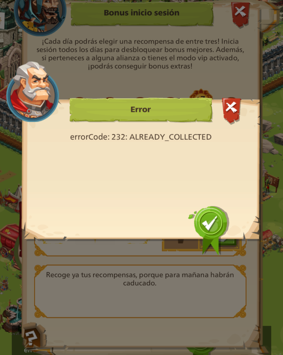 Tengo un problema con el bonus de inicio de sesion, concretamente con el bonus vip, me ha ocurrido en dos ocasiones desde la ultima actualizacion, adjunto captura del error...