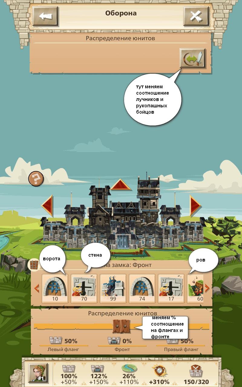 В замке верхние информационные строчки имеют дополнительные меню. Так ткнув в герб замка вы откроете меню с информацией об игроке, в котором в свою очередь доступны подменю и так далее. Квадратик с рубинами справа в той же строке служит для покупки рубинов. Ниже в строке ресурсов вы можете получить информацию что и как и с какой продуктивностью производится в вашем замке, а нажав на полосочки справа вы получите информацию о количестве простых или королевских ресурсов в замке (если уровнем доросли).