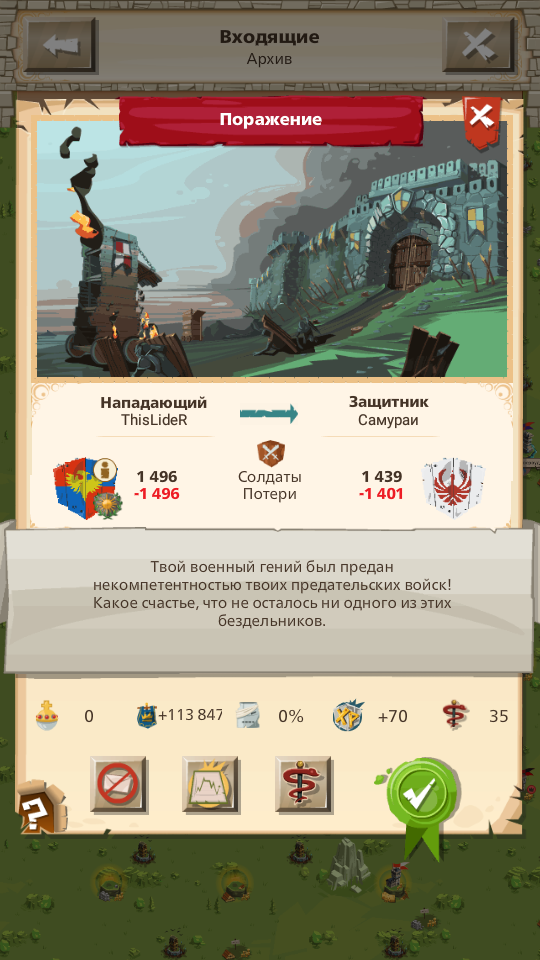 Здравствуйте! Сегодня 10.12.2016 я отправил атаку на самурая (ивент). За 5 мин до сражения у самурая сохранялся деф в количестве 1.4 тыс. Фронт пустой, а по обеим флангам было 160 юнитов = 32 лучники 128 ближнего боя. Наместник самурая 38/23. Мой генерал от кочевников Дорго, прокаченный. В связи с этим я на первую волну поставил ужасов с обвесом, а на остольных штандарты. В итоге: поражение: фланги не пробиты , погибло 1496 офа, у самурая уничтожено 1401 из 1439. Прошу проверить и исправить ошибки. Это не единичный случай и не только у меня. И если возможно прошу с корректировать проведенную мною сражение и вернуть уцелевших моих юнитов, если токовые есть. Спасибо за уделенное мне время!